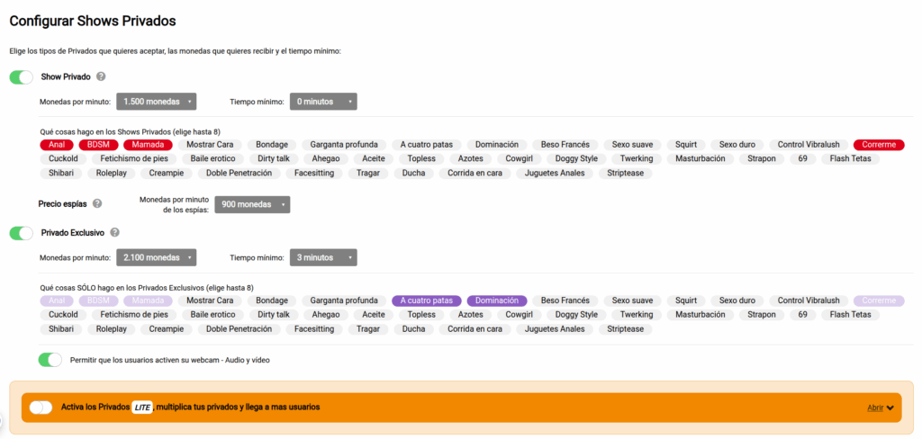 - En el show privado puedo configurar la cantidad de monedas para los espías.